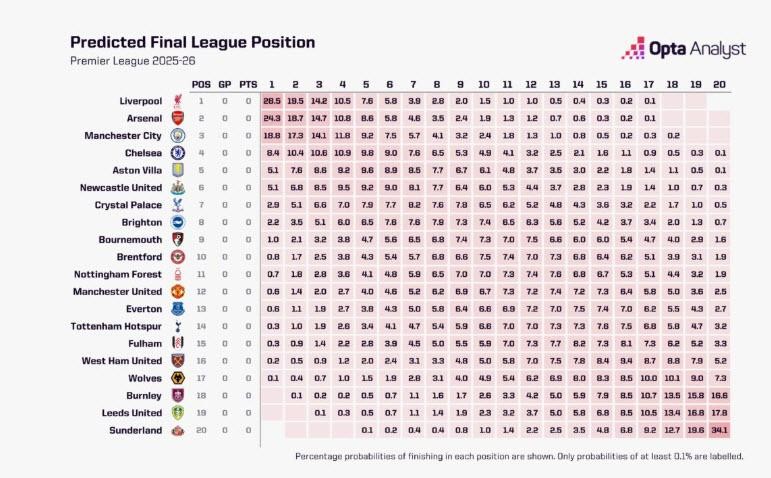 ซูเปอร์คอมพิวเตอร์ของ Opta มีการทำนายโอกาสที่ทีมต่างๆจะคว้าแชมป์พรีเมียร์ลีกในฤดูกาลใหม่